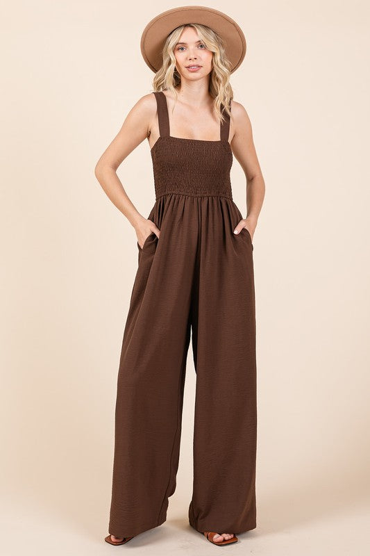 Cameron Ash Brown Smocked Wide Strap Wide Leg Overalls